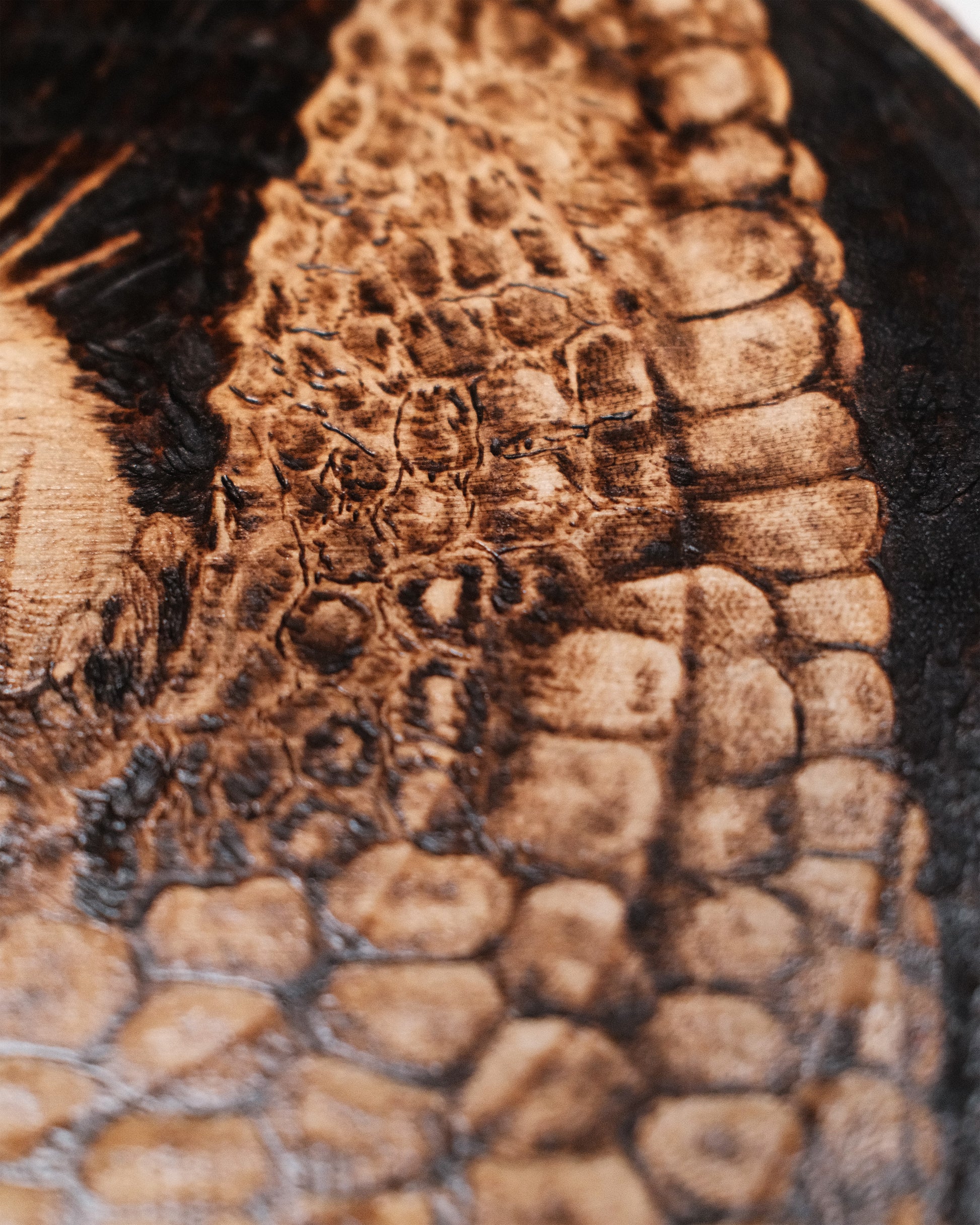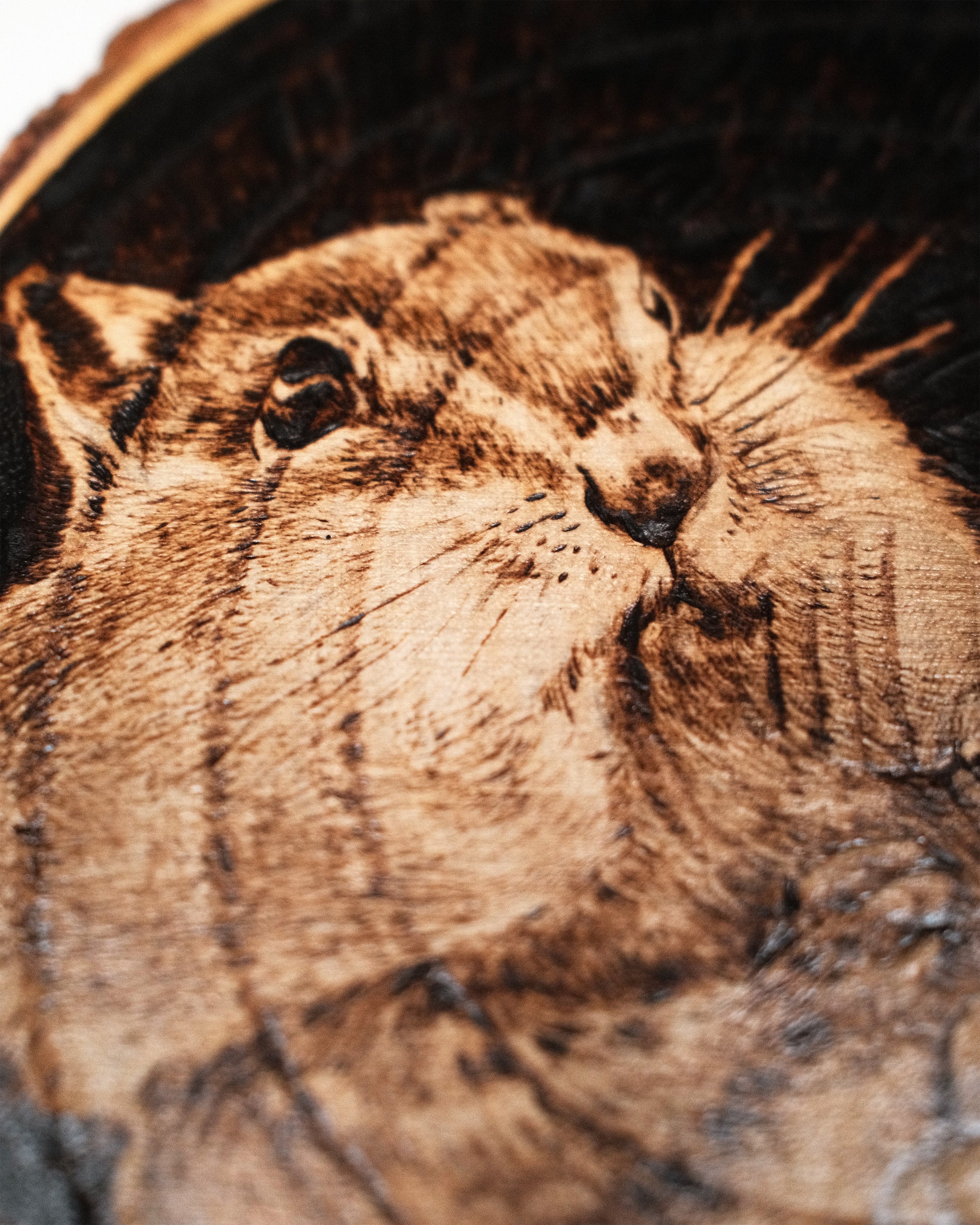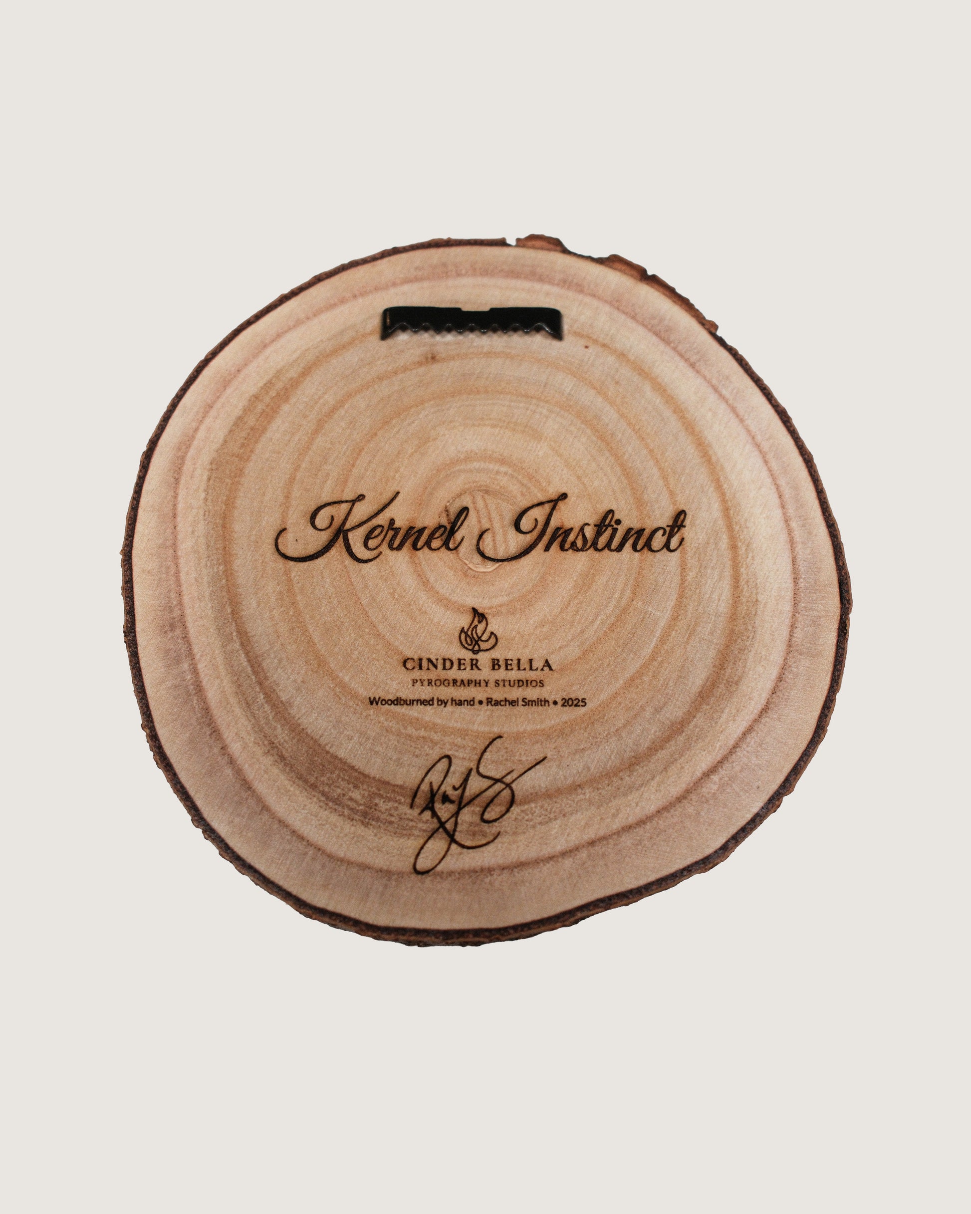 Kernel Instinct is an original pyrography piece created by Ray Smith in 2025. Burned by hand on Live-Edge Basswood, its textures capture the natural grain of the wood, transforming it into a lasting work of fine art.