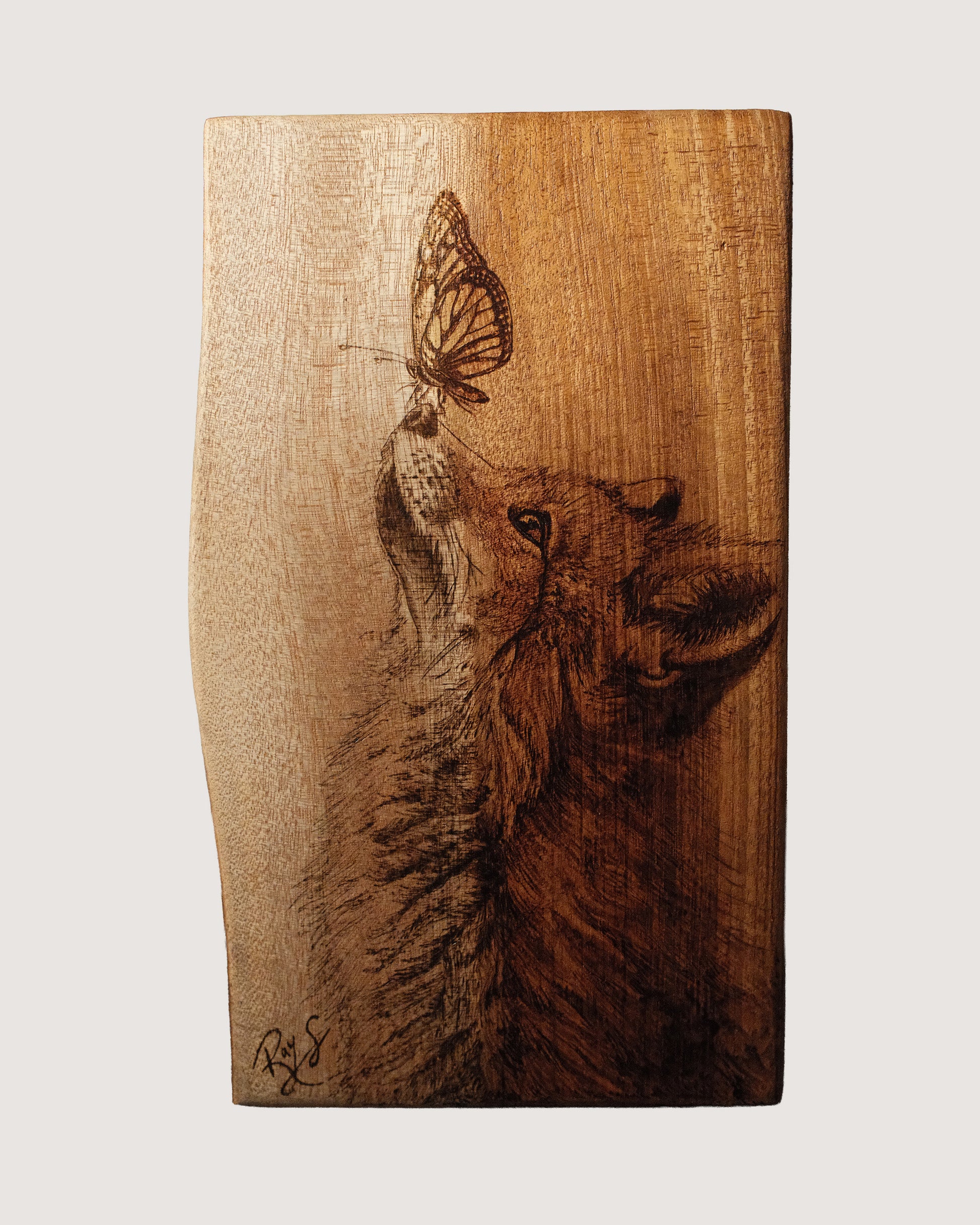 Nose to Nose is an original pyrography piece created by Rachel Smith in 2025. Burned by hand on Red Cedar, its textures capture the natural grain of the wood, transforming it into a lasting work of fine art.