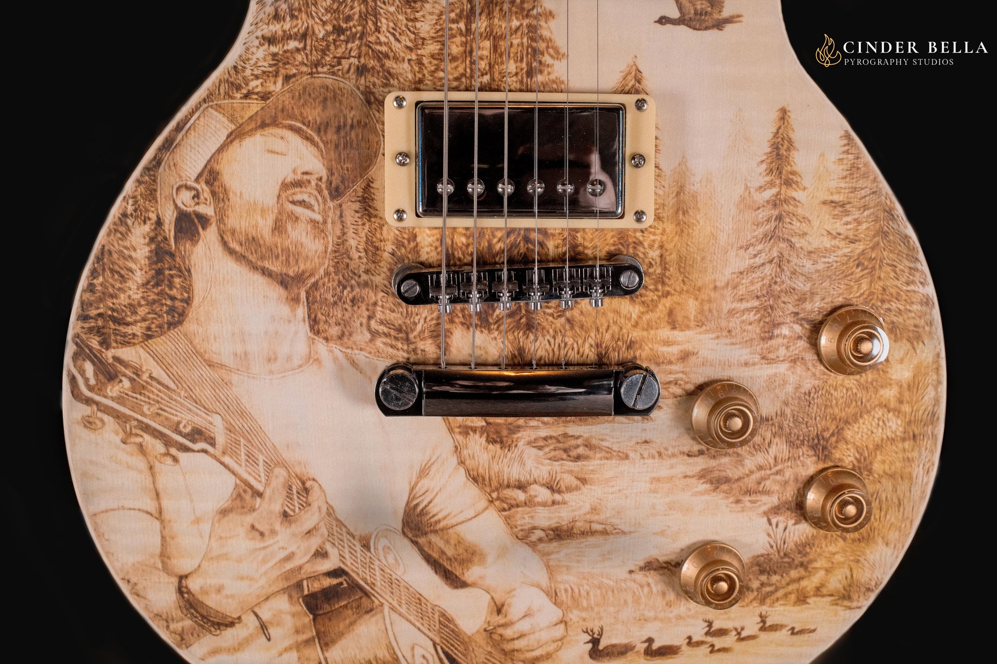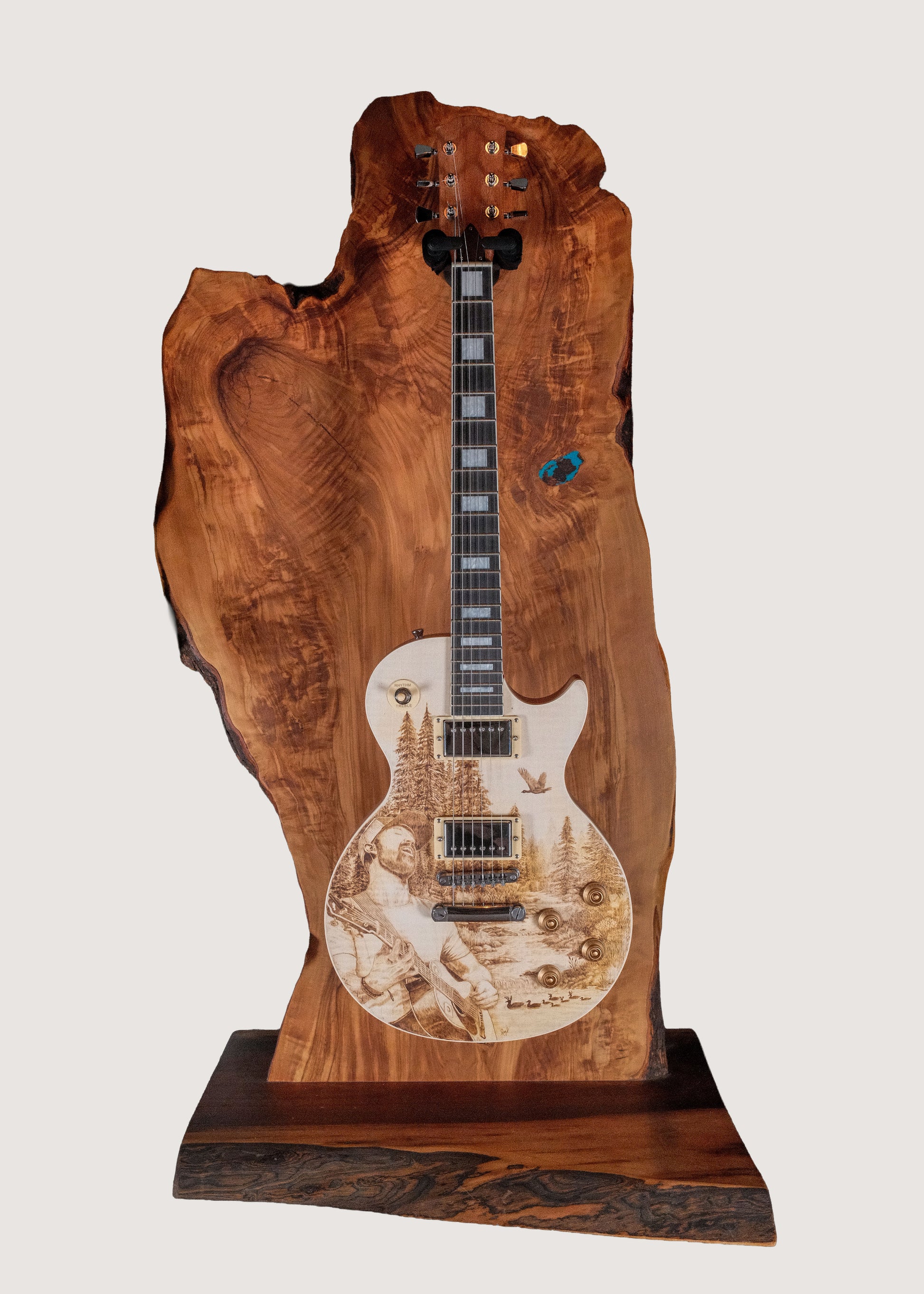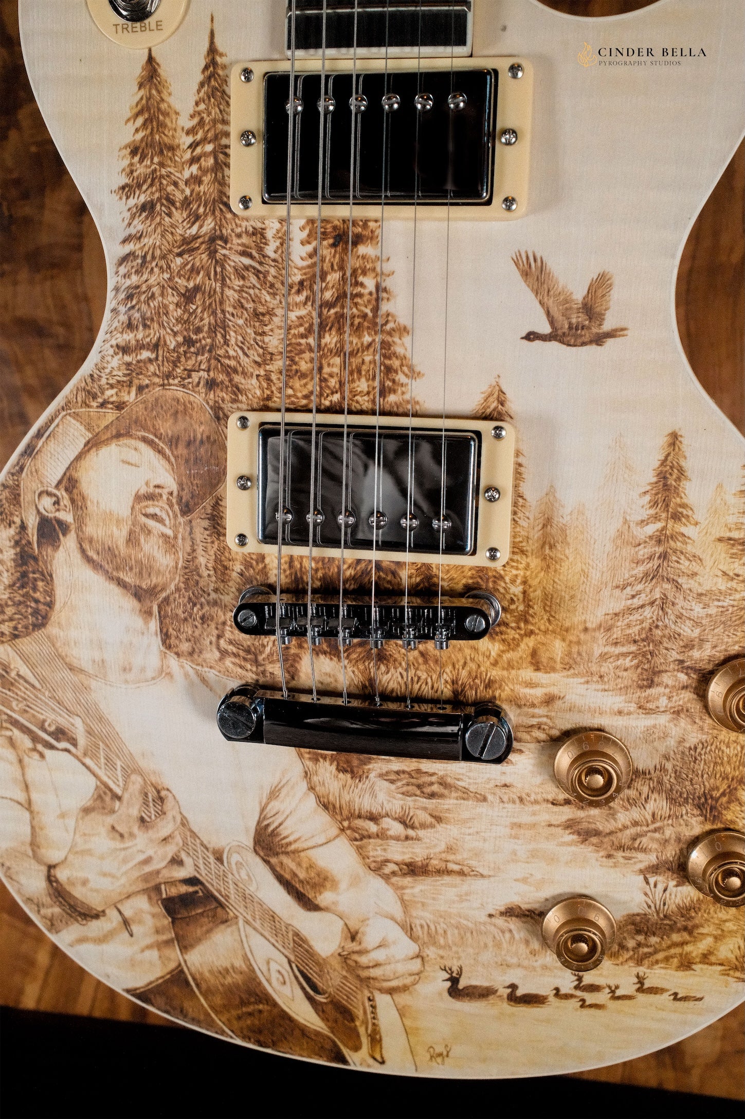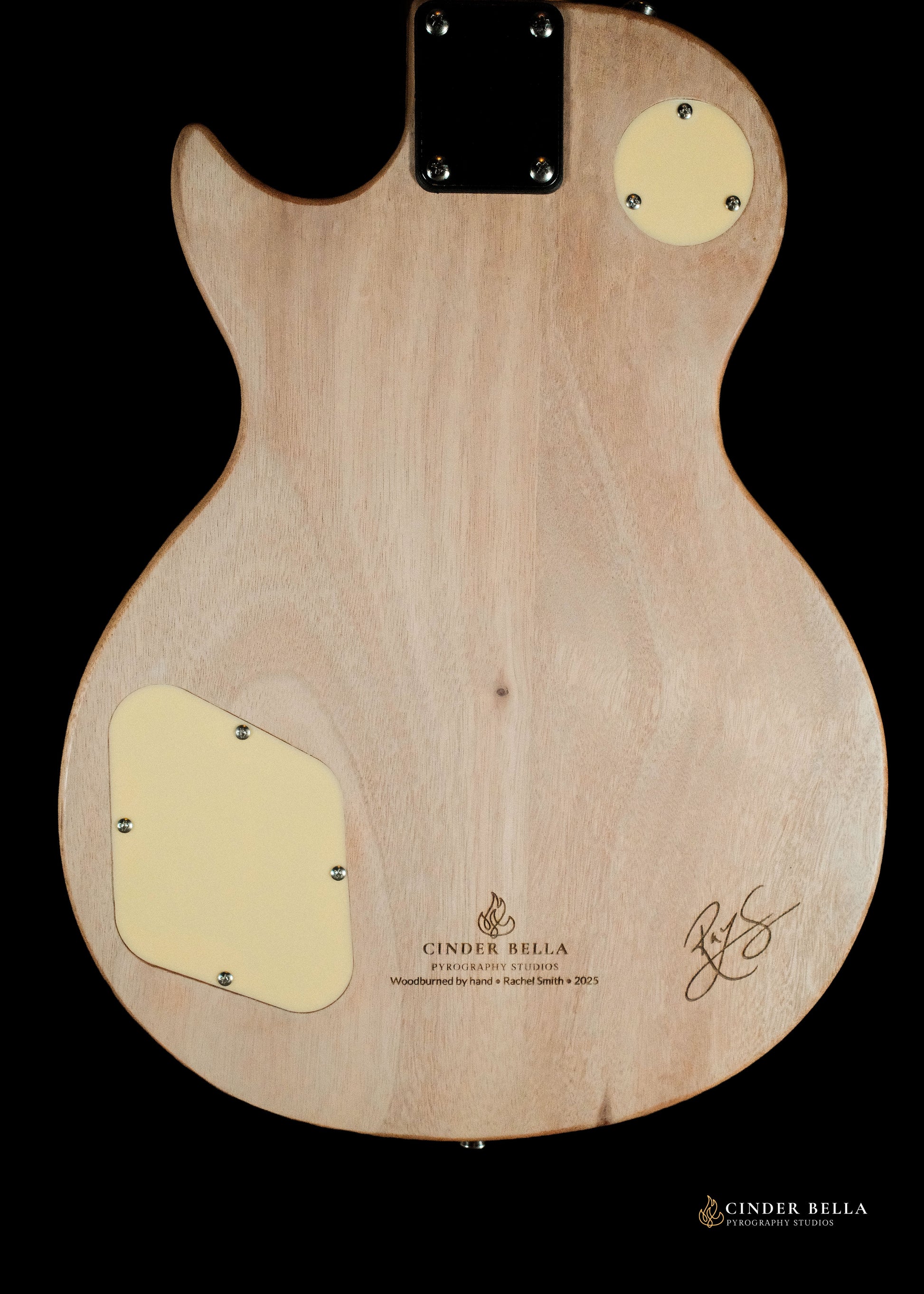 Where the Water Leads is an original pyrography piece created by Rachel Smith in 2025. Burned by hand on Maple Topped Les Paul Style Guitar, its textures capture the natural grain of the wood, transforming it into a lasting work of fine art.