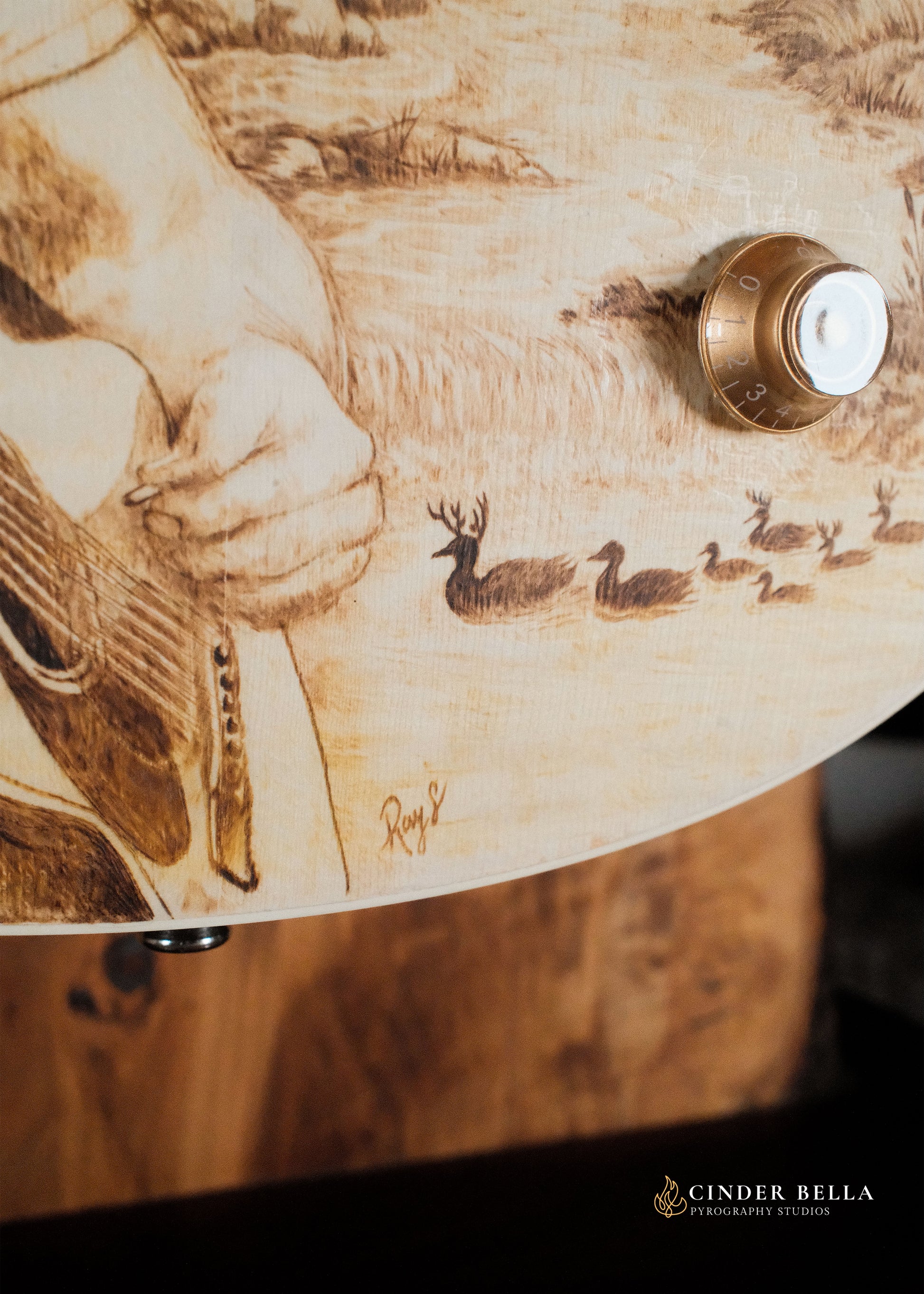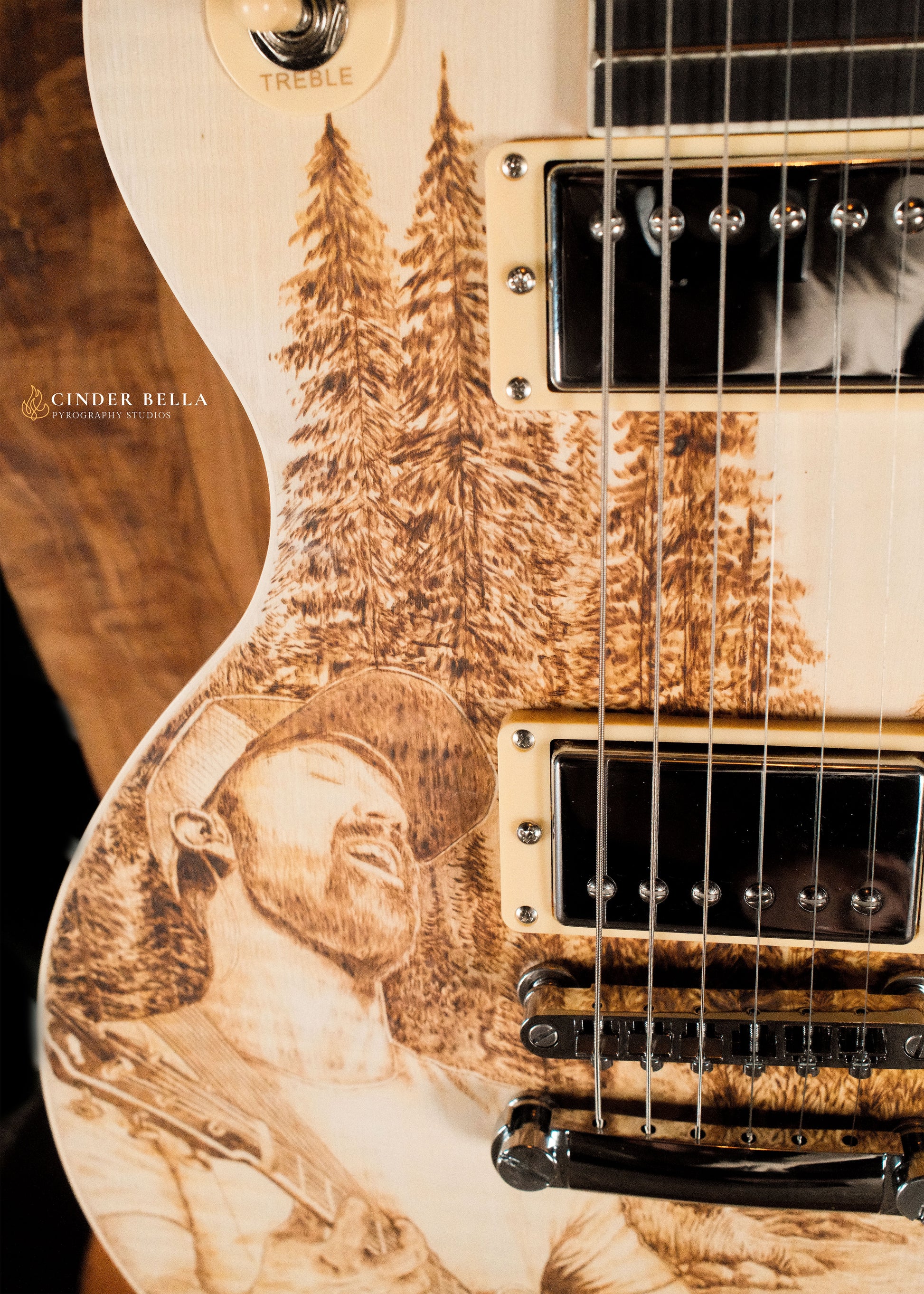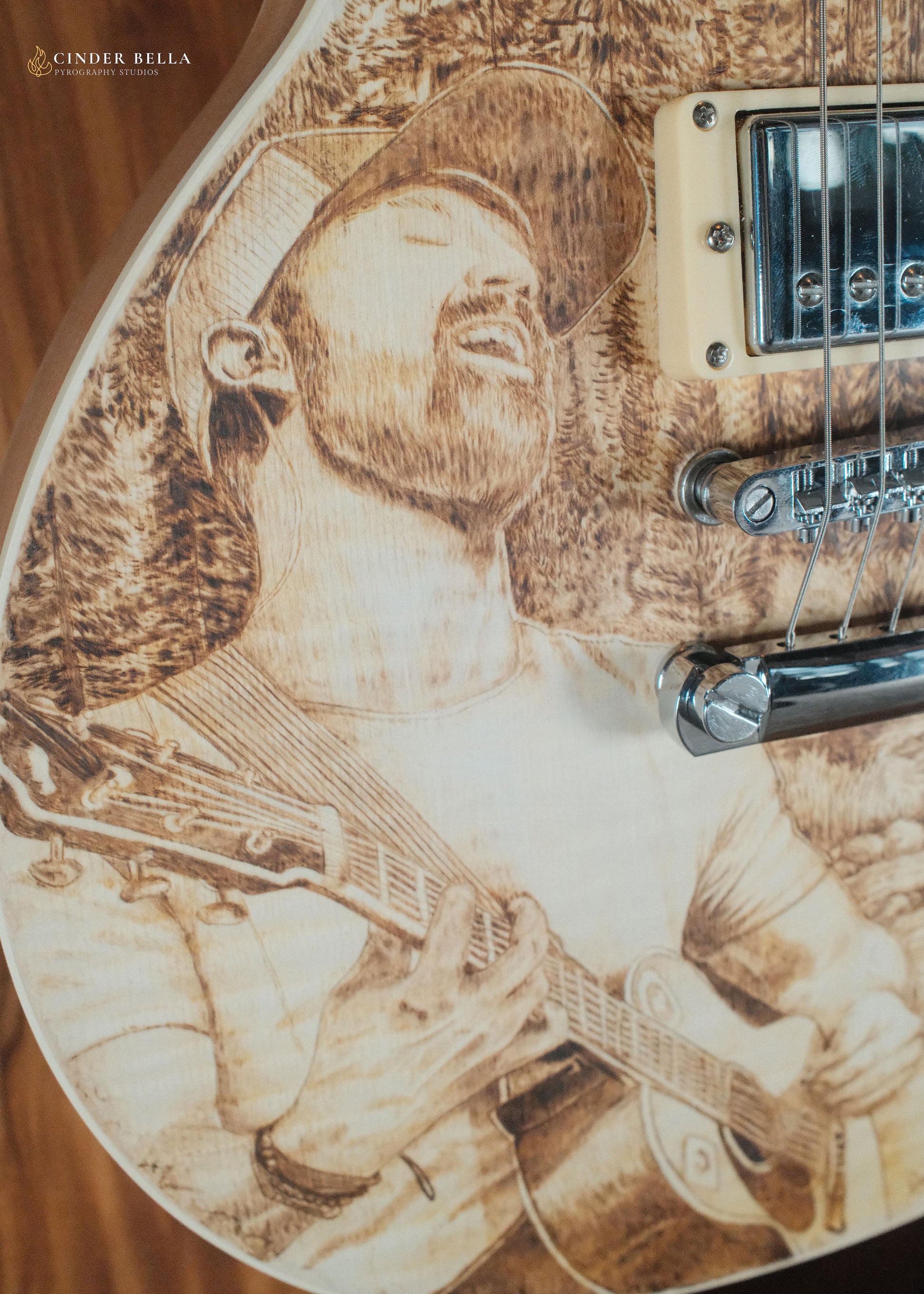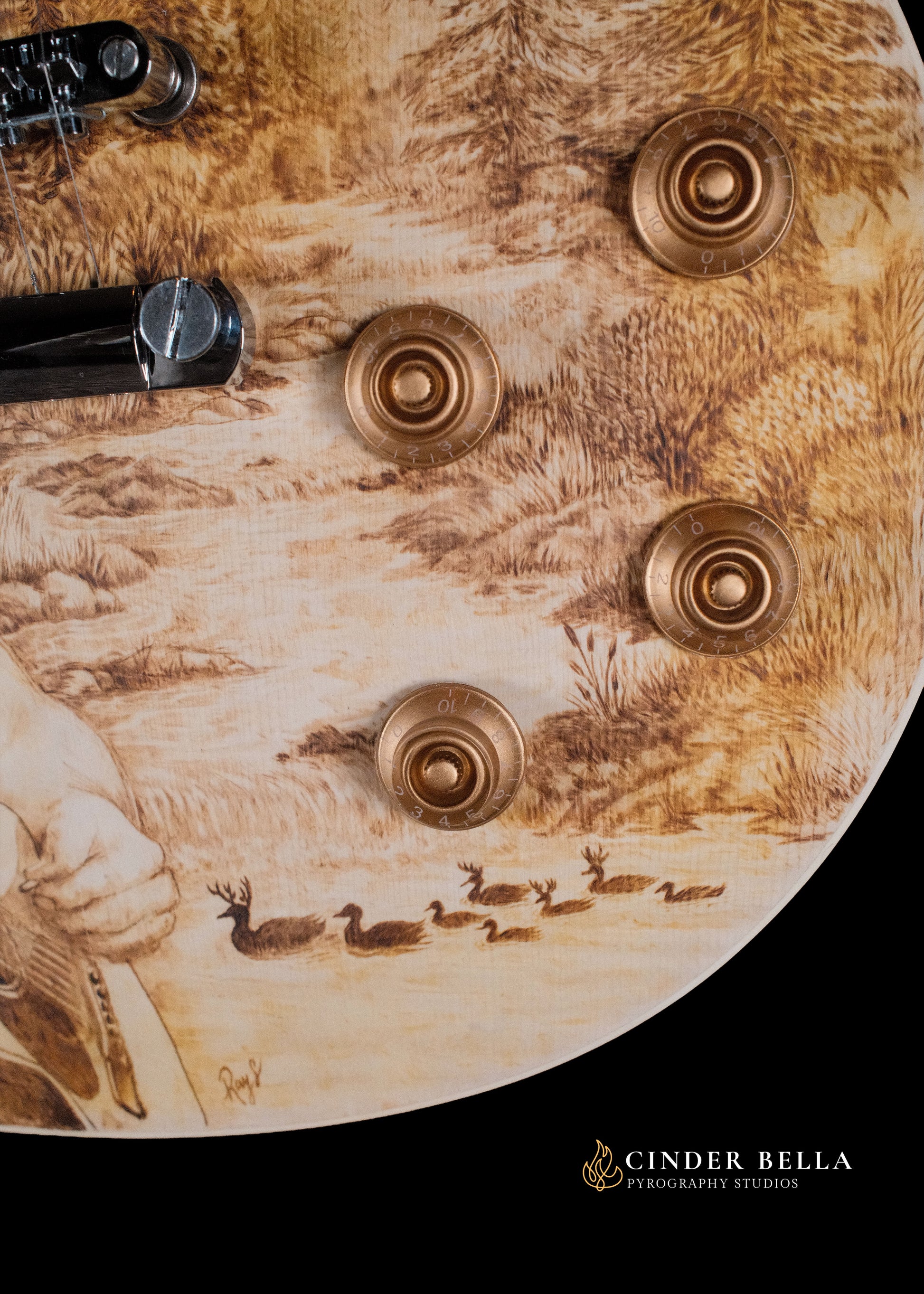 Where the Water Leads is an original pyrography piece created by Rachel Smith in 2025. Burned by hand on Maple Topped Les Paul Style Guitar, its textures capture the natural grain of the wood, transforming it into a lasting work of fine art.
